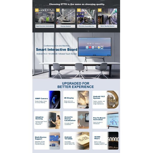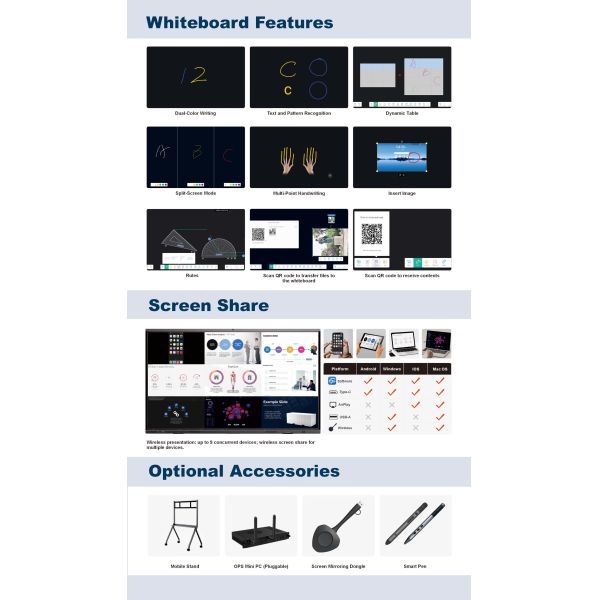 This advanced 115-inch interactive whiteboard combines cutting-edge technology with versatile functionality, ideal for modern teaching environments and professional meetings. Featuring multi-OS support and high-performance hardware, it delivers an exceptional interactive experience.