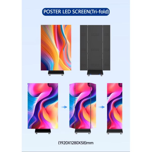 Inovation Folding Design, Space-saving: Folds to reduce volume by 50%,optimizing storage and transport compared to traditional posters; when folded, it transforms into a double-sided screen, capable of displaying the same or different contents on each side;