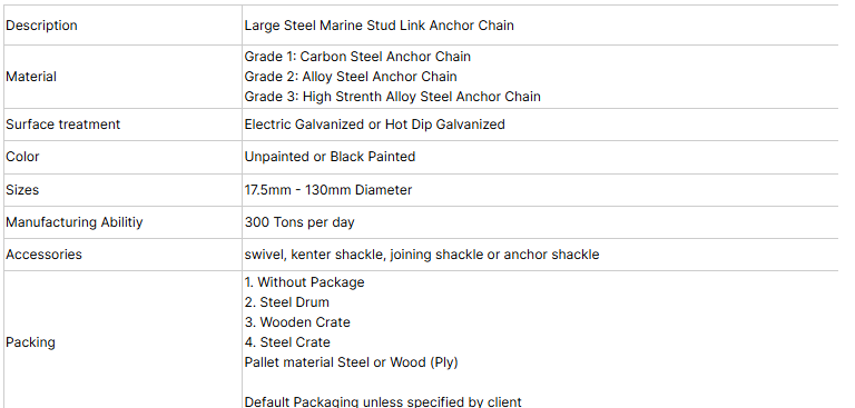 - **Application Scenarios**: Widely used in anchoring systems for various vessels, including fishing boats, yachts, merchant ships, and warships, ensuring stability while moored. It is also suitable for securing and stabilizing offshore drilling platforms, floating docks, and other marine engineering equipment, as well as other areas requiring high strength and corrosion resistance, such as docks and port facilities.
